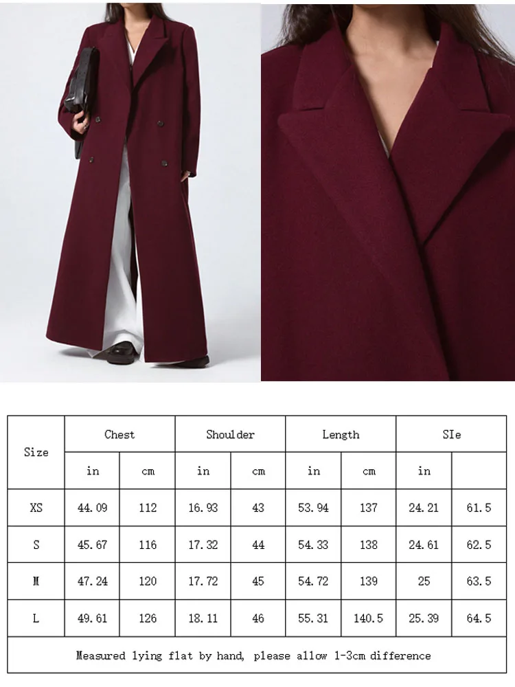 The double-breasted closure, turn-down collar, and smooth solid-color finish create a refined look ideal for professional settings and stylish outings. Its knee-length cut enhances femininity while offering warmth and coverage for cooler seasons.